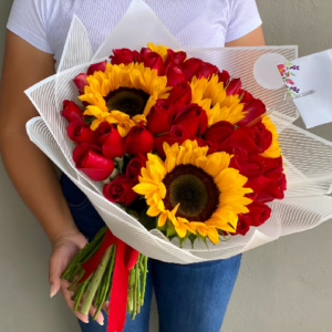 O preço original era: R$222.00.R$169.00O preço atual é: R$169.00. ComprarBUQUÊ DE GIRASSOL E ROSAS VERMELHAS