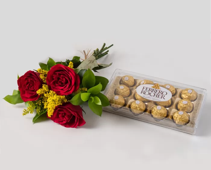 Arranjo de 3 Rosas Vermelhas e Chocolate