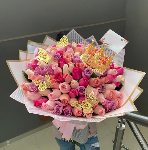 Lindo Buquê Buchon Arranjo Floral de 100 Rosas Sortidas acompanhado de uma Linda Coroa Metálica e Borboletas decorativas