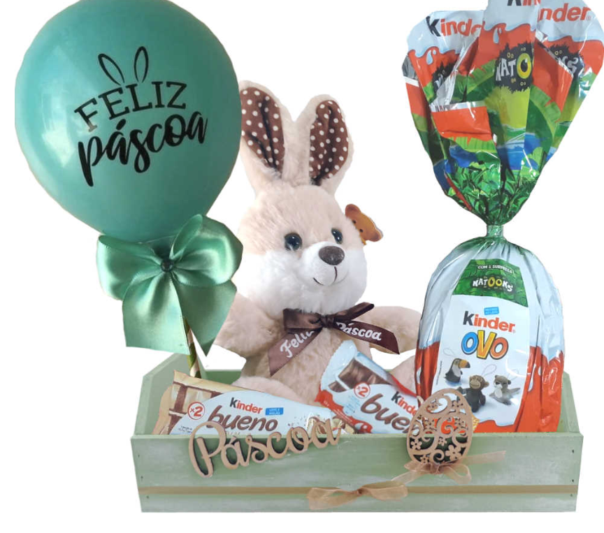 Cesta de Páscoa Kinder com pelúcia e balão personalizado. Acompanha Kinder Ovo, Kinder Bueno e chocolates.